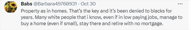 還有網(wǎng)友表示,美國(guó)政府在加劇美國(guó)財(cái)富不平等方面“功不可沒(méi)”。在美國(guó)政策高壓之下,非裔甚至不配擁有住房。
