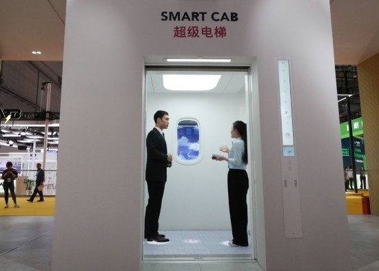 11月5日,工作人員(右)在第六屆進(jìn)博會上向參觀者介紹奧的斯公司全新推出的超級電梯。