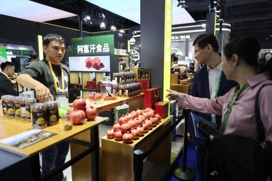 11月6日,在第六屆進(jìn)博會食品及農(nóng)產(chǎn)品展區(qū),阿富汗食品吸引參展人員。
