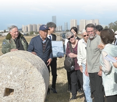 在云南昆明呈貢機場舊址,代表團一行聆聽講解員講述石碾背后的故事。呈貢機場曾是飛虎隊在昆明的主要基地之一,機場建設期間,當?shù)厝嗣窭瓌泳薮笫肫秸艿?,付出艱苦努力。本報記者 劉玲玲攝