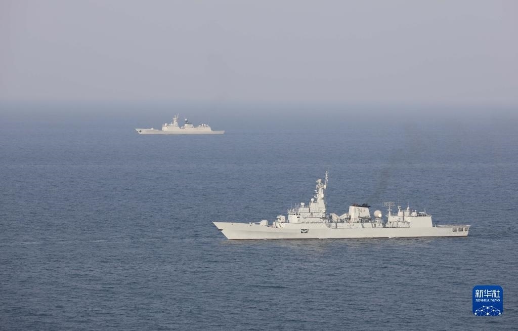 中巴“海洋衛(wèi)士-3”海上聯(lián)合演習(xí)在阿拉伯海北部??沼蚺e行,雙方艦艇組織編隊(duì)運(yùn)動(dòng)(11月14日攝)。新華社發(fā)(姜霞攝)
