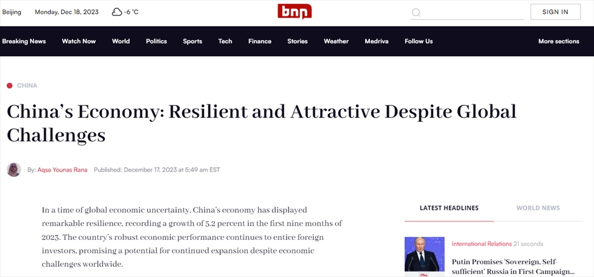 美國新聞網站BNN Breaking報道認為,在全球經濟充滿不確定性的背景下,中國經濟表現(xiàn)出驚人的韌性,2023年前三季增長5.2%。