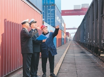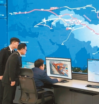 在中哈(連云港)物流合作基地?cái)?shù)字化調(diào)度中心,海關(guān)關(guān)員在對(duì)中歐班列動(dòng)態(tài)、現(xiàn)場(chǎng)裝卸情況等進(jìn)行實(shí)時(shí)監(jiān)控。近年來(lái),連云港海關(guān)還創(chuàng)新應(yīng)用中歐班列“保稅+出口”集裝箱混拼、“鐵路快速通關(guān)”等通關(guān)便利化舉措,不斷提升貨物通關(guān)效率。本報(bào)記者 石 暢攝