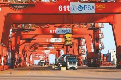貨輪停靠連云港港口后,集裝箱通過(guò)“船車(chē)直取”的模式,被直接吊裝上短駁車(chē),分流至中哈(連云港)物流合作基地,貨物集結(jié)后被裝上火車(chē),運(yùn)往中亞、歐洲等國(guó)家和地區(qū)。 本報(bào)記者 石 暢攝