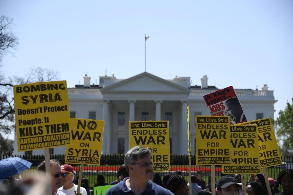 2018年4月14日,在美國華盛頓白宮北側,人們手持標語抗議對敘利亞進行軍事打擊。新華社記者楊承霖攝