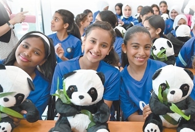 2023年9月17日,在科威特哈瓦利省的科威特中國(guó)文化中心,學(xué)習(xí)漢語(yǔ)的孩子們與熊貓玩具合影。阿薩德攝(新華社發(fā))