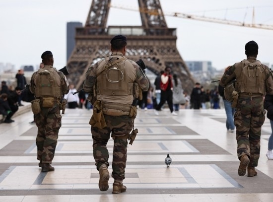 3月25日,法國(guó)士兵在巴黎特羅卡德羅廣場(chǎng)附近巡邏警戒。新華社記者高靜攝