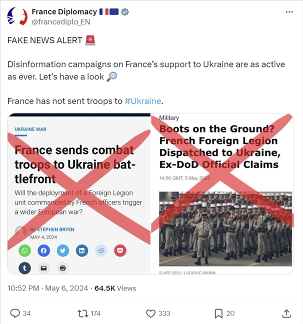 該說法隨后遭到法國外交部明確否認。5月6日,法國外交部在 X平臺上明確表示:“法國還沒有向烏克蘭派兵。”