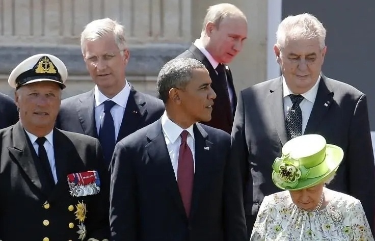 2014年,諾曼底登陸70周年紀(jì)念活動(dòng)上,俄總統(tǒng)普京與時(shí)任美國(guó)總統(tǒng)奧巴馬同框。