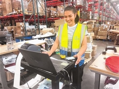 在位于美國(guó)新澤西的海外倉(cāng)內(nèi),杰西卡·卡斯蒂羅正在電腦前工作。孫伊豆攝