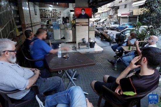 9月19日,在黎巴嫩貝魯特,人們收看真主黨領(lǐng)導人納斯魯拉發(fā)表電視講話。新華社發(fā)(比拉爾·賈維希攝)