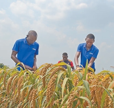在中國—烏干達農(nóng)業(yè)合作產(chǎn)業(yè)園的試驗田里,當(dāng)?shù)毓と苏谑斋@中國狐尾小米。龍文靖攝