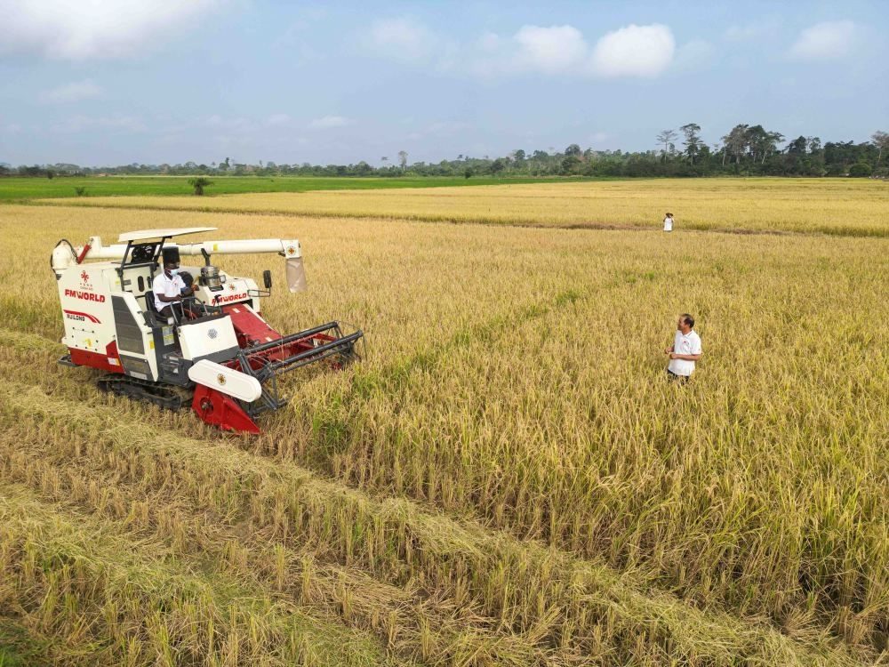 2024年1月8日,在科特迪瓦南部迪沃省格格杜墾區(qū),中國援科農(nóng)業(yè)技術(shù)合作組組長郭長友(右一)指導(dǎo)稻農(nóng)駕駛收割機(jī)收割水稻(無人機(jī)照片)。格格杜墾區(qū)是中科兩國農(nóng)業(yè)合作示范基地,也是科特迪瓦全國聞名的水稻種植基地。