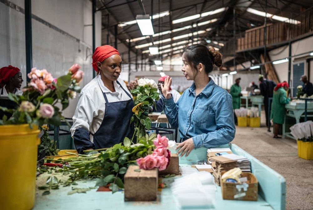 2024年5月18日,湖南璽悅國際貿(mào)易有限公司負(fù)責(zé)人黃梓楠(右)在肯尼亞納紐基的坦布濟(jì)花卉農(nóng)場挑選鮮花。中國政府2021年11月宣布為非洲農(nóng)產(chǎn)品輸華建立“綠色通道”,縮短檢驗檢疫時間,擴(kuò)大關(guān)稅豁免,為肯尼亞鮮花及非洲各國的牛油果、柑橘、菠蘿等特色農(nóng)產(chǎn)品打開了銷路。