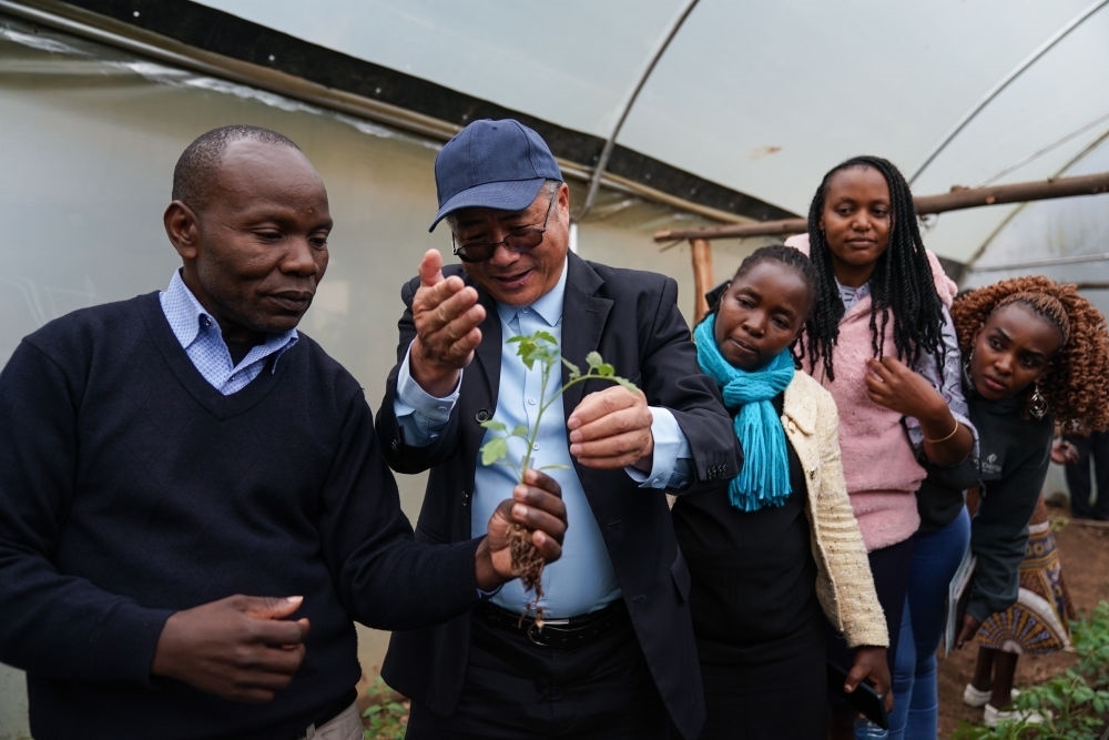 2023年9月18日,在肯尼亞納庫魯郡舉辦的中非農(nóng)業(yè)發(fā)展和減貧示范村番茄生產(chǎn)培訓(xùn)班上,來自中國的農(nóng)學(xué)教授劉高瓊(左二)為肯方學(xué)員指導(dǎo)農(nóng)業(yè)技術(shù)。多年來,中國農(nóng)業(yè)專家在當(dāng)?shù)亻_展了知識培訓(xùn)、技術(shù)指導(dǎo)和農(nóng)業(yè)設(shè)施修繕等工作,有效助力中國先進(jìn)的農(nóng)業(yè)技術(shù)在納庫魯?shù)貐^(qū)的示范推廣,幫助農(nóng)民實現(xiàn)增收減貧的目標(biāo)。