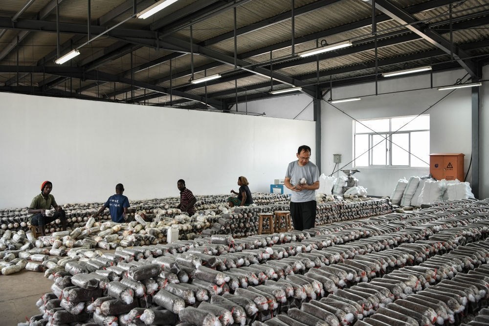 2024年8月13日,在盧旺達(dá)南方省胡耶區(qū)的中國援盧農(nóng)業(yè)技術(shù)示范中心,菌草專家陳曉斌(右)檢查菌袋。自菌草技術(shù)引入盧旺達(dá)以來,當(dāng)?shù)鼐莓a(chǎn)業(yè)發(fā)展迅速,不僅為市場提供了豐富的食用菌產(chǎn)品,還創(chuàng)造了大量就業(yè)機(jī)會。