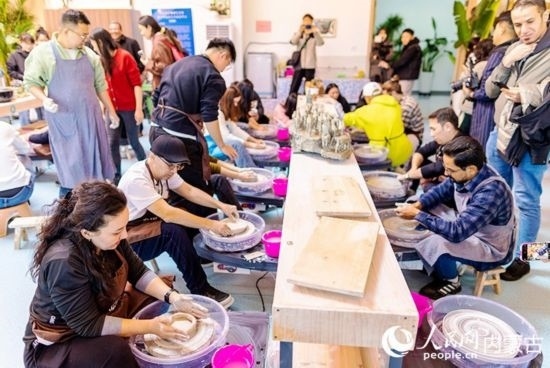外媒記者進行泥塑體驗。人民網記者 張雪冬攝