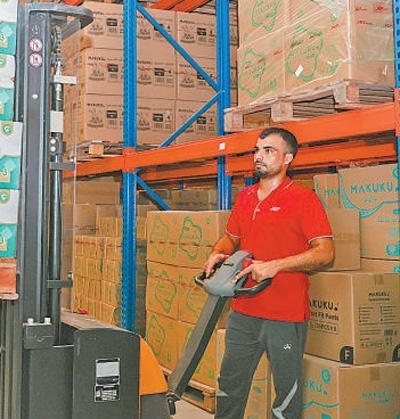 工作人員在位于阿聯(lián)酋迪拜的極兔速遞海外倉內(nèi)搬運貨物。本報記者 任皓宇攝
