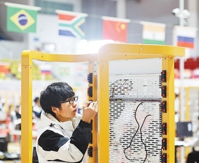 在江蘇省南通市,參賽選手在2023年金磚國家職業(yè)技能大賽中國分賽區(qū)物聯(lián)網(wǎng)賽項國際總決賽中比拼。徐培欽攝(人民視覺)