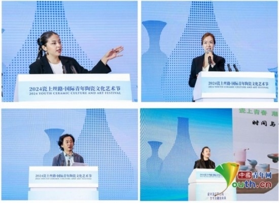 在主題演講環(huán)節(jié),四名陶瓷藝術(shù)領(lǐng)域青年藝術(shù)家代表分別上臺做了分享。土耳其青年藝術(shù)家佩琳因?qū)μ沾晌幕纳詈衽d趣而來到景德鎮(zhèn),她分享了自己對陶瓷文化的思考與理解,她認(rèn)為“陶瓷藝術(shù)飽含著人們對文化多樣性繁榮發(fā)展、美美與共的美好期許”。韓國青年藝術(shù)家宋耎姝以自己的作品《銀之?!窞槔痛蠹曳窒砹藙?chuàng)作感悟,她認(rèn)為“陶瓷藝術(shù)創(chuàng)作應(yīng)當(dāng)關(guān)注人與自然的和諧關(guān)系,從大自然中汲取養(yǎng)分”。第十二屆全國青聯(lián)委員、江西省青聯(lián)副主席、國家級技能大師工作室領(lǐng)辦人歐陽敏致力于陶瓷文化的傳播,他在分享中強(qiáng)調(diào),“陶瓷文化是中華文明與世界文明交流互鑒的橋梁和載體。各國青年應(yīng)當(dāng)做文化傳承創(chuàng)新的踐行者,充分挖掘各國歷史文化的獨(dú)特魅力和時代價值,把傳統(tǒng)文化與潮流文化融匯在陶瓷藝術(shù)的創(chuàng)作中,為共同推動人類文明發(fā)展進(jìn)步貢獻(xiàn)青春力量?!本暗骆?zhèn)學(xué)院陶瓷美術(shù)與設(shè)計(jì)藝術(shù)學(xué)院院長張博以《陶瓷藝術(shù)在空間中的應(yīng)用》為題,分享了陶瓷文化所代表的中華傳統(tǒng)文化如何與當(dāng)代潮流文化相結(jié)合,共同繪制出一幅幅五彩斑斕的人類文明畫卷。