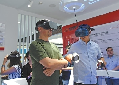 國際青年代表在玉門風(fēng)電場VR電力安全生產(chǎn)實訓(xùn)室體驗。 圖為本報記者趙帥杰攝