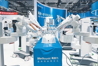 在進(jìn)博會醫(yī)療器械及醫(yī)藥保健館,美敦力展示的Hugo RAS機(jī)器人輔助手術(shù)系統(tǒng)。本報(bào)記者 高 喬攝