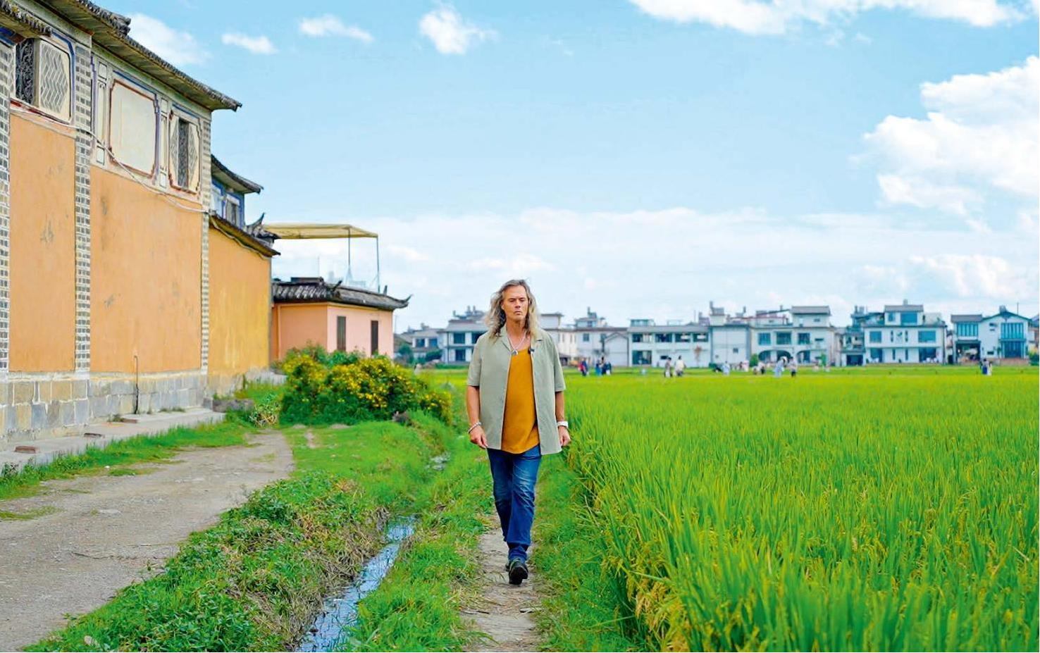 林登行走在喜洲稻田。