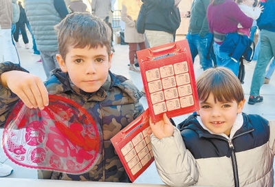 1月19日,在西班牙阿利坎特2025蛇年春節(jié)廟會(huì)上,小朋友們收集中國(guó)生肖印章并兌換新春福字窗花。