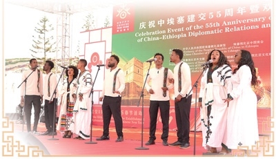 在近日舉辦的“慶祝中埃塞建交55周年暨歡樂(lè)春節(jié)活動(dòng)”上,當(dāng)?shù)孛癖姾铣H肀葋唫鹘y(tǒng)歌曲。