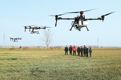 近日,安徽省亳州市蒙城縣樂土鎮(zhèn)屈廟村田間,農(nóng)機(jī)技術(shù)人員(左三)向飛手介紹植保無人機(jī)作業(yè)的安全要求及注意事項。