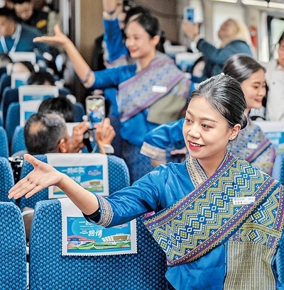 列車沿著蜿蜒的鐵路線前行,沿途地勢變化多樣,時而穿行在山洞之中,時而飛馳在高架橋之上。車上舉行了中老鐵路春節(jié)文化主題活動,歌曲、舞蹈、變臉等節(jié)目紛紛上演,一路上喝彩聲、歡笑聲不斷。“車廂變成了一個流動的舞臺,精彩的節(jié)目讓人大飽眼福!”喬納森說。
