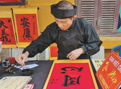 4月13日,在越南河內(nèi)胡志明故居,當?shù)貢覟橹袊慰蜁鴮憽巴摹薄?/p>