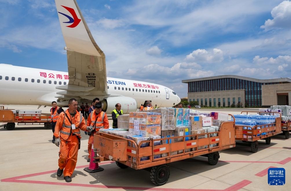 4月19日,工作人員在昆明長水機場準備將中國政府援緬衛(wèi)生防疫隊攜帶的物資裝機。新華社記者 陳欣波 攝