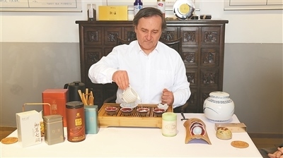 品茶已經(jīng)成為許多意大利人的日常生活習(xí)慣。意大利茶業(yè)與花草茶協(xié)會主席馬可·貝托納十分喜愛中國茶,并收藏有正山小種、普洱茶等多種中國名茶。圖為馬可·貝托納在展示茶藝。