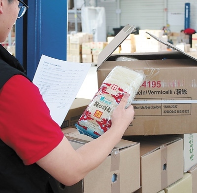 圖為東方超市員工在清點剛運抵貨運中心的龍口粉絲。作為中國最早與歐盟互認(rèn)的地理標(biāo)志產(chǎn)品之一,龍口粉絲一直深受德國顧客的青睞。