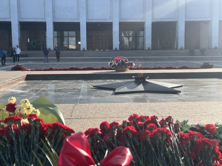 當(dāng)?shù)貢r(shí)間5月6日下午,勝利廣場(chǎng)上的長(zhǎng)明火兩側(cè)放滿鮮花。劉少華 攝