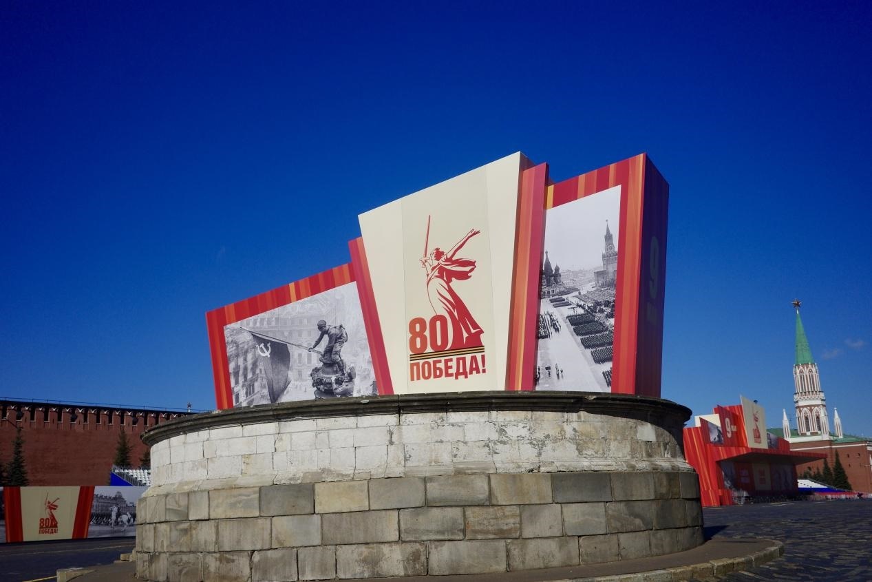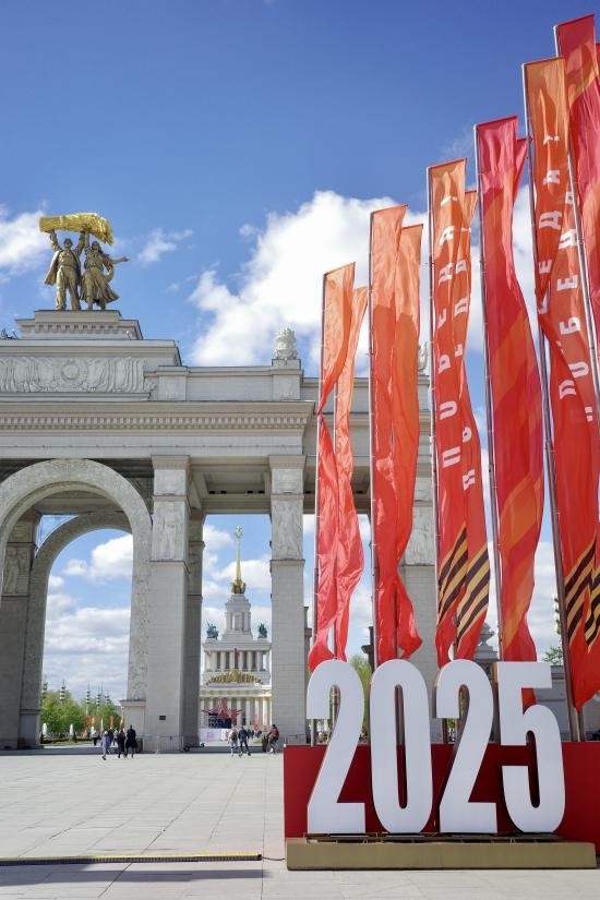 當(dāng)?shù)貢r(shí)間5月6日,莫斯科威登漢(國(guó)民經(jīng)濟(jì)成就展覽館)大門前一側(cè),布置好了2025標(biāo)志和紀(jì)念旗幟。劉少華 攝