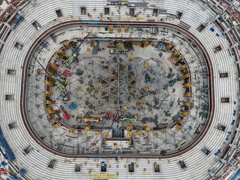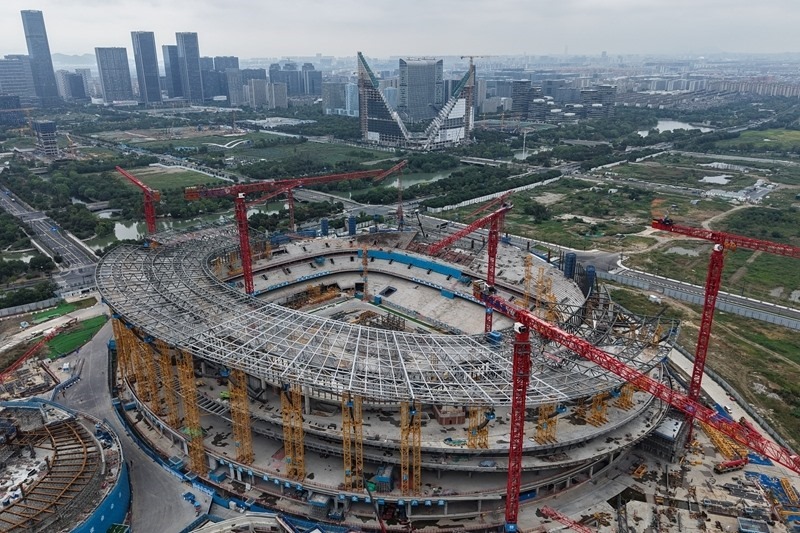 10月21日拍攝的余杭國際體育中心工程足球場項目(無人機照片)。據(jù)了解,足球場鋼結(jié)構(gòu)設(shè)計總重量達42000噸,其中屋蓋鋼結(jié)構(gòu)占18000噸。