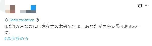 此外,高市在個人社交媒體上的相關言論同樣引發(fā)巨大爭議。她近期發(fā)布的帖文在日本網(wǎng)民中激起強烈反響,評論區(qū)滿是對其錯誤言論的不滿和譴責,不少民眾要求其撤回涉臺不當言論、向中國道歉,并辭去首相職務。