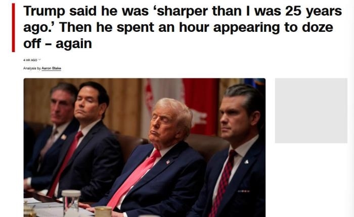 美國有線電視新聞網(wǎng)(CNN)注意到,當美國商務部長盧特尼克談及貿(mào)易戰(zhàn)時,特朗普“似乎難以睜開眼睛”。在美國教育部長麥克馬洪和美國衛(wèi)生與公眾服務部長小羅伯特·肯尼迪發(fā)言時,特朗普“似乎僵住了,閉著眼睛,每次持續(xù)10到15秒,然后才轉(zhuǎn)動眼球或點頭”。