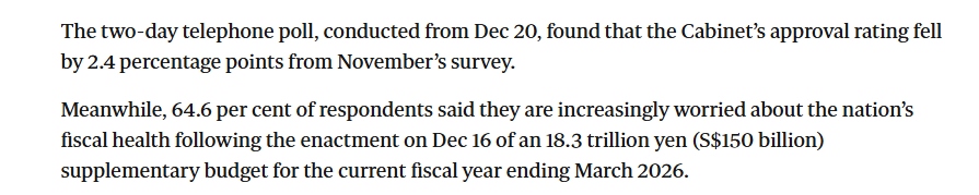 報道指出,目前進口化石燃料占日本發(fā)電量的60%-70%,是推高通脹的主要因素之一,也已影響自民黨支持率。而日本共同社21日公布的最新民調顯示,高市早苗內閣支持率較11月的調查下降了2.4個百分點,有64.6%的受訪者表示,隨著本月16日2025財年追加預算案的通過,他們對國家財政狀況的擔憂日益加劇。