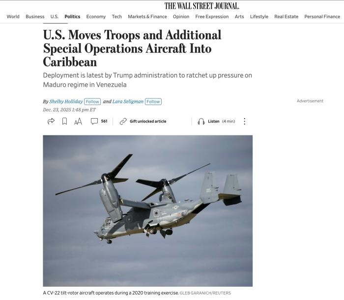 中新網(wǎng)12月24日電 據(jù)美國(guó)《華爾街日?qǐng)?bào)》報(bào)道,本周美國(guó)已向加勒比地區(qū)調(diào)遣了大批特種作戰(zhàn)飛機(jī)、美軍人員及裝備,為華盛頓在委內(nèi)瑞拉采取軍事行動(dòng)提供了更多選擇。