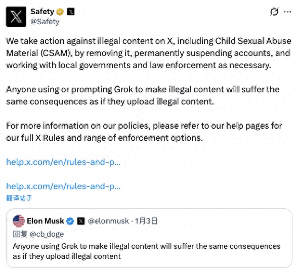 X表示,平臺會對非法內(nèi)容采取行動,包括刪除資料、封號,并在必要時與執(zhí)法機(jī)構(gòu)展開合作。馬斯克也在周末的一條帖子中強調(diào),任何使用“格羅克”制作非法內(nèi)容的人,將面臨與上傳非法內(nèi)容同樣的法律后果。