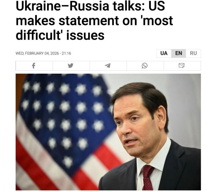 中新網(wǎng)2月5日電 綜合RBC-烏克蘭通訊社等外媒報道,由俄羅斯、美國、烏克蘭三國代表組成的安全問題工作組4日在阿聯(lián)酋首都阿布扎比舉行新一輪會談。美國國務(wù)卿魯比奧表示,會談已取得一定進展,但最棘手問題仍未解決。