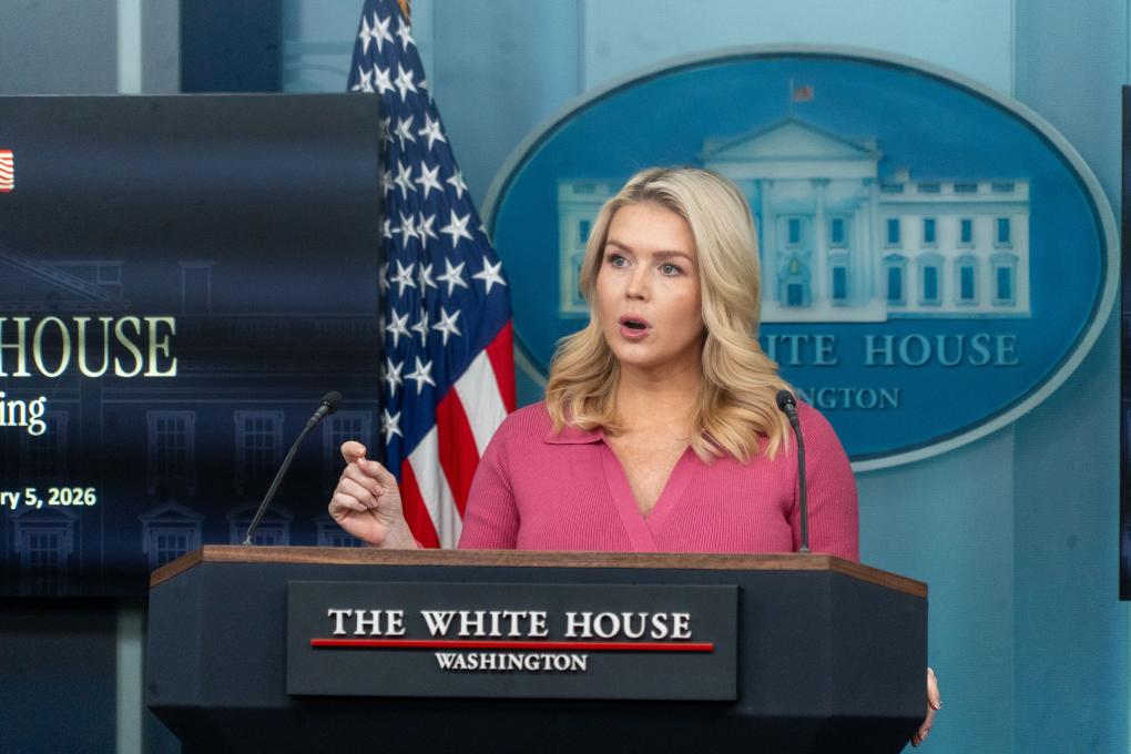 2月5日,在美國首都華盛頓,白宮新聞秘書萊維特出席記者會。新華社發(fā)(李源清攝)
