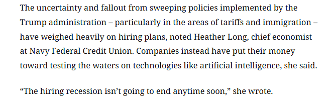 報道還援引美國海軍聯(lián)邦信用合作社(Navy Federal Credit Union)首席經(jīng)濟(jì)學(xué)家希瑟·朗的觀點(diǎn)稱,特朗普政府推行的一系列政策,尤其是關(guān)稅和移民政策,所帶來的不確定性及后果對招聘計劃造成了沉重影響。希瑟·朗認(rèn)為,招聘市場的低迷狀況短期內(nèi)不會結(jié)束。