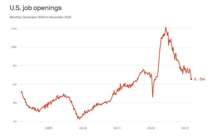 美國《國會山報》援引美國勞工統(tǒng)計局的數(shù)據(jù)報道稱,美國2025年12月份的職位空缺數(shù)量為650萬個,呈下降趨勢,較上年同期減少了96.6萬個。