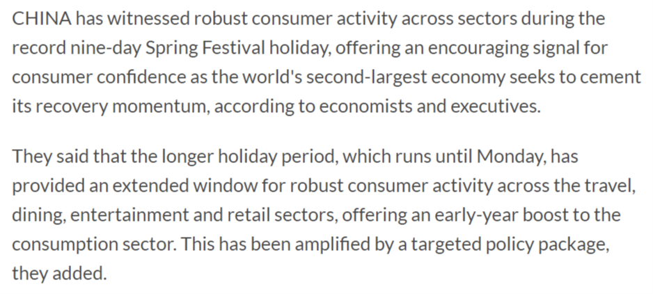 馬來西亞《星報(bào)》23日?qǐng)?bào)道稱,在創(chuàng)紀(jì)錄的9天春節(jié)假期期間,中國(guó)各領(lǐng)域消費(fèi)活動(dòng)強(qiáng)勁,這為世界第二大經(jīng)濟(jì)體鞏固復(fù)蘇勢(shì)頭傳遞了積極信號(hào),也彰顯了消費(fèi)者信心。