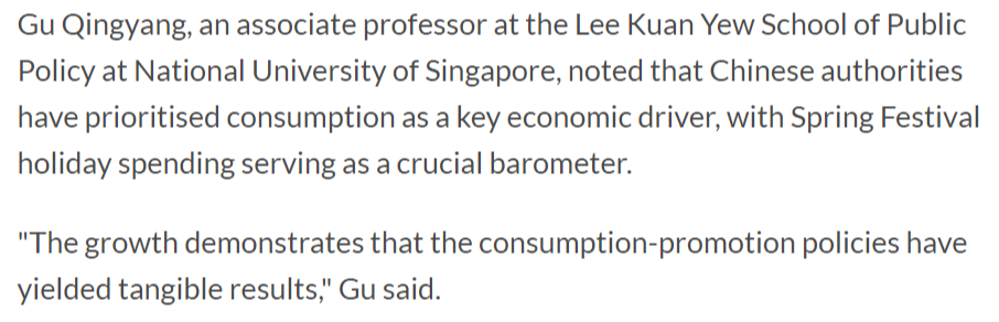 報(bào)道援引新加坡國(guó)立大學(xué)李光耀公共政策學(xué)院副教授顧清揚(yáng)的話表示,中國(guó)政府已將消費(fèi)列為關(guān)鍵的經(jīng)濟(jì)驅(qū)動(dòng)力,春節(jié)假期消費(fèi)則成為重要晴雨表。“增長(zhǎng)表明促消費(fèi)政策已取得切實(shí)成效。”