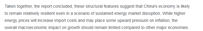 報告總結(jié)稱,即便能源市場持續(xù)動蕩,中國受沖擊程度也將明顯輕于其他主要經(jīng)濟(jì)體。雖然能源價格上漲可能推升進(jìn)口成本并產(chǎn)生一定通脹壓力,但對整體經(jīng)濟(jì)增長的宏觀影響將保持可控。